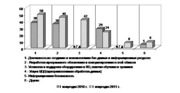 Направления деятельности ИТ–организаций в сфере информационно-технологических услуг Согласно результатам пилотного обследования, в I полугодии 2011 г. одними из наиболее динамичных направлений ИТ–компаний стала деятельность по созданию и использованию баз данных и информационных ресурсов, а также разработка программного обеспечения и консультирования в этой области. По сравнению с аналогичным периодом 2010 г., в указанных сегментах было зафиксировано увеличение доли организаций, осуществлявших услуги по данным направлениям, с 38 до 50% и с 36 до 46% соответственно. К преобладающему виду деятельности компаний, участвовавших в опросе, также следует отнести установку и поддержку оборудования и ПО, включая обучение и тренинги. В данной сфере в I полугодии 2011 г. работало 42% компаний. В то же время было зафиксировано снижение доли компаний с 29% в I полугодии 2010 г. до 24%, предоставлявших услуги централизованной обработки данных. Данная тенденция подтверждает незрелость российского рынка ЦОД, заключающуюся в малой масштабности данного сегмента, готовности заказчиков покупать некачественные услуги, а также в пассивности поставщиков. Рис.2. Направления деятельности организаций, оказывающих информационно-технологические услуги (% от общего числа организаций)