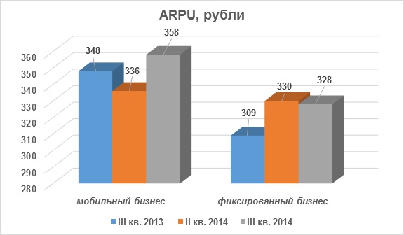 Драйвером роста мобильного бизнеса МТС остается мобильный Интернет. По итогам квартала выручка от передачи данных составила 17,2 млрд рублей, увеличившись за квартал на 12,1 %, а за год – на 37,2 %. При этом общая выручка от VAS по итогам III квартала 2014 года составила 27,4 млрд рублей, увеличившись за квартал на 8,9 %, а за год – на 22,2 %. Все это повлияло на ARPU абонентов МТС – особенно с учетом того, что оператор изменил методологию учета, перейдя с шестимесячной на трехмесячную. По итогам отчетного периода ARPU мобильных абонентов оператора составило 358 рублей, увеличившись за квартал на 6,6 %. MOU при этом вырос на 1,1 % за квартал, составив 377 минут. Напомним, что наиболее провальным по последнему показателю для МТС был первый квартал текущего года, когда MOU составлял лишь 353 минуты. ARPU на массовом рынке в фиксированном сегменте по итогам квартала составил 328 рублей, снизившись на 0,5 % за квартал. За год динамика более оптимистична: прирост составил 6,1 %. Квартальное снижение ARPU, по мнению представителей МТС, является следствием сезонных факторов.