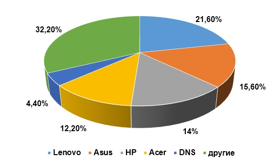 Рынок ПК в России, 2014 г., по данным IDC При этом поставки деск-топов по сравнению с прошлым годом сократились на 15 % и в натуральном выражении составили немногим более 3,04 млн штук. Ноутбукам не повезло больше – здесь падение продаж за год составило 26,9 % по сравнению с 2013 годом. По итогам 2014 года в России было продано 4,87 млн ноутбуков. При этом если в сегменте настольных ПК лидером по итогам года остается HP, то в сегменте портативных ПК лидером является Lenovo, который находится на втором месте по продажам десктопов. HP же в продажах ноутбуков занимает лишь четвертое место, пропустив вперед еще и ASUS и Acer. «Моноблоки, ультратонкие устройства и ноутбуки-трансформеры имеют хорошие перспективы дальнейшего роста, – комментирует Наталья Виноградова, старший аналитик рынка персональных компьютеров и планшетов IDC Россия. - Планшеты и смартфоны все-таки не обладают достаточным функционалом, если речь заходит об использовании этих устройств для бизнеса. Появление новых компактных недорогих систем делает рынок персональных компьютеров более конкурентоспособным». По данным IDC Quarterly PC Tracker, за четвертый квартал 2014 года объем поставок ПК в Россию составил 1,85 млн штук. При этом падение в натуральном выражении составило 32,2 %, а в денежном – 33,6 %. Лидером по продажам в четвертом квартале стал Hewlett-Packard, занявший долю в 15,3 % от всех поставленных за квартал ПК. На втором месте с 14,8 % находится Lenovo, на третьем – ASUS с 13,8 %. Acer получил 12,4 %, а DNS – 5,5 %.
