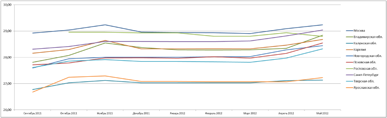 И, наконец, стоимость ДТ с сентября по май оказалась самой высокой не только в двух столицах, но и на территории Карелии (см. график 5, Цены на дизельное топливо, сентябрь 2011 г. - май 2012 г.). Ярославская область была снова отмечена, как один из лидеров по наиболее низкому показателю стоимости топлива, равно как и Псковская. Однако заправить транспорт дизелем с сентября по май дешевле всего можно было в Калужской области.